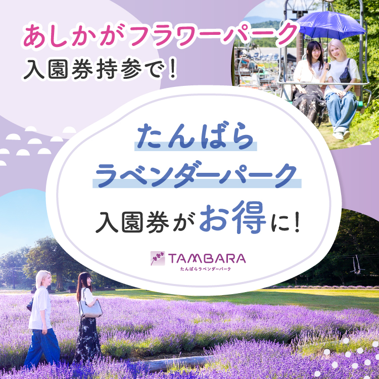 使用済みの「あしかがフラワーパーク」入園券を、入園券販売窓口でご提示いただくと、たんばらラベンダーパーク入園券がとってもお得にご購入できます!