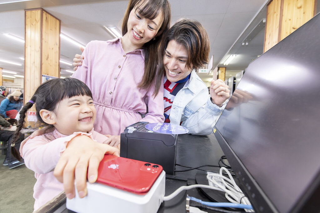 レンタル専用受付で、レンタルWEB事前決済をされたお客様はメールに届いているQRコードをスキャンして出てきたレシートをお受け取りください。事前申込をされていない場合は、専用の端末で必要事項を入力してからレシートを出力してください。